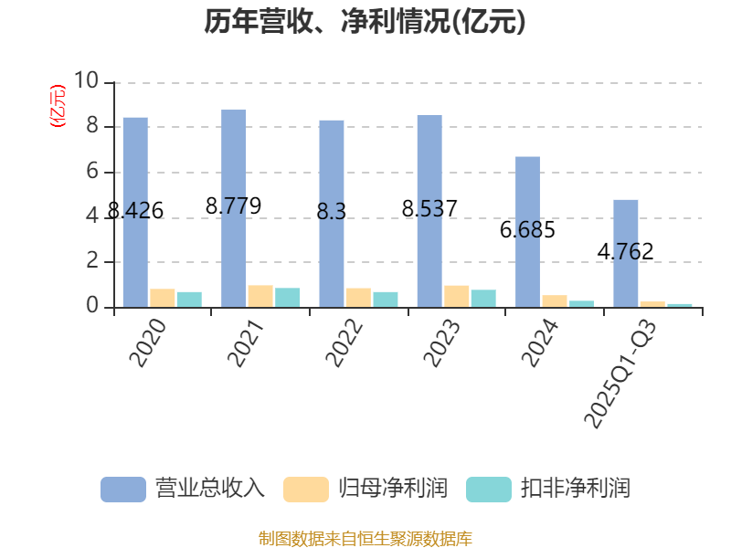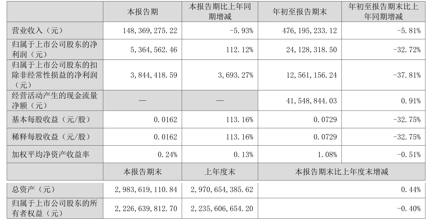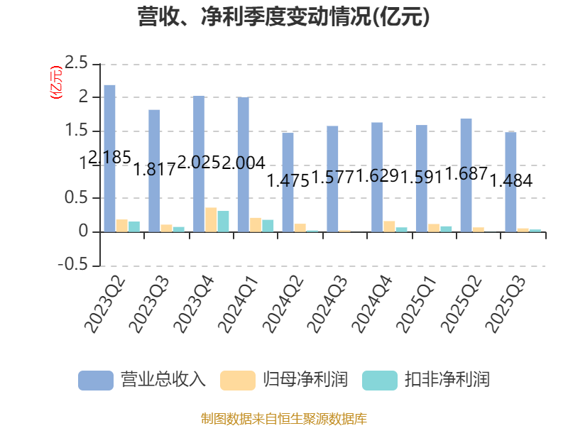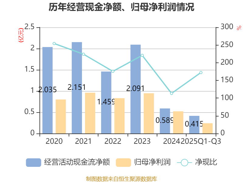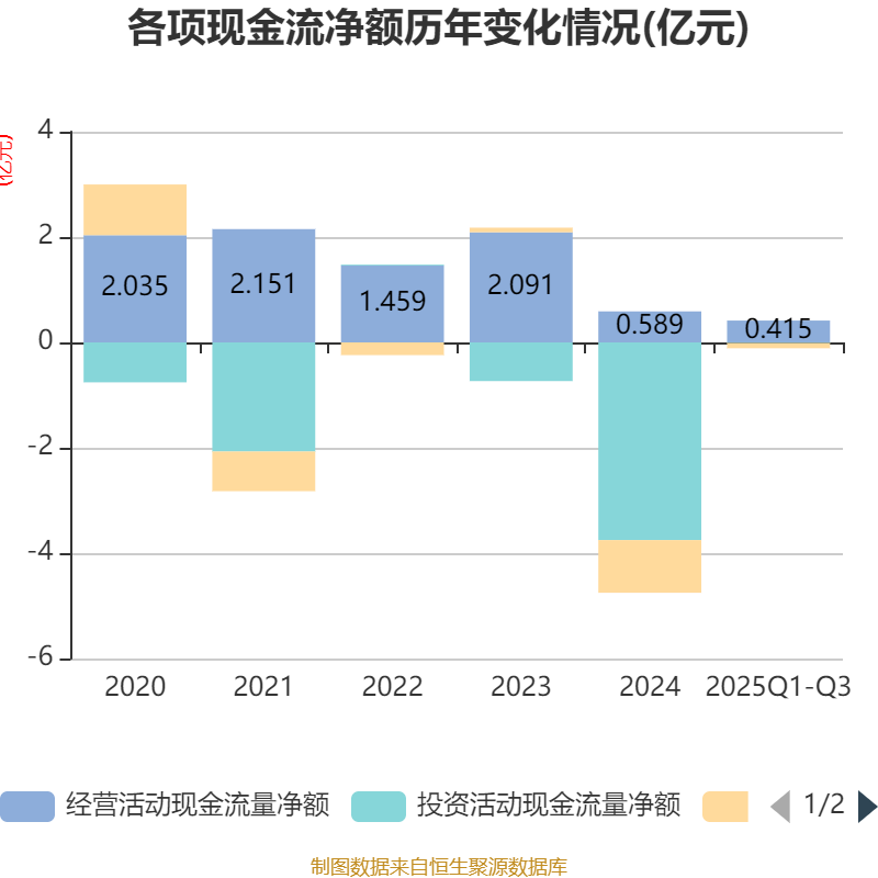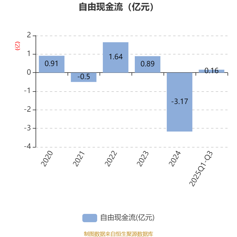 2025年前三季度,公司经营活动现金流净额为4154.88万元,同比增长0.91%;筹资活动现金流净额-985.76万元,同比增加5445.46万元;投资活动现金流净额-119.08万元,上年同期为-3.56亿元。