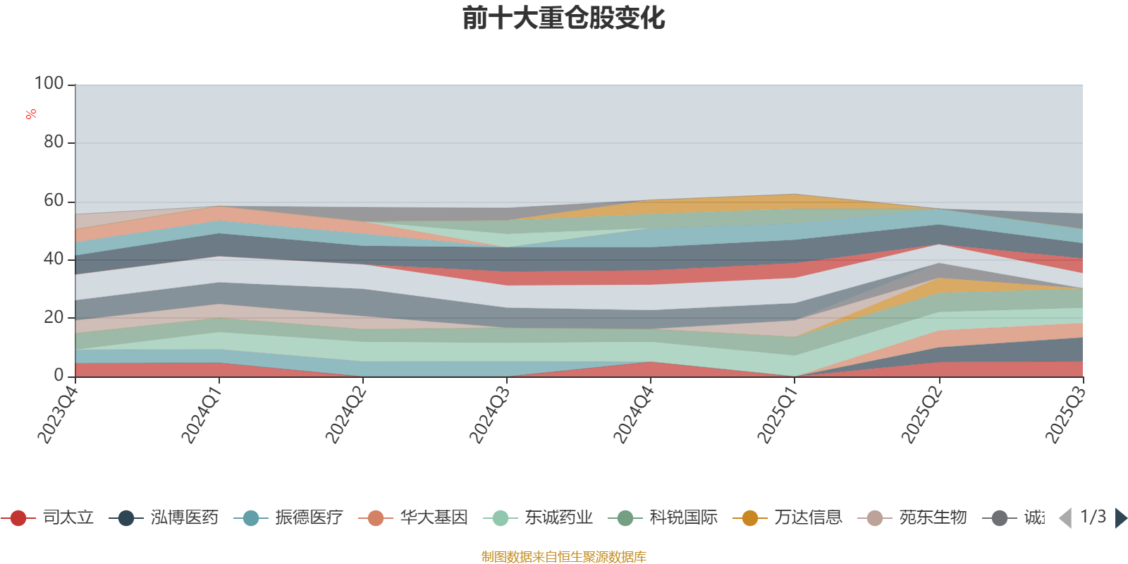 该基金持股集中度较高。截至2025年三季度末,基金十大重仓股分别是泓博医药、科锐国际、新华医疗、健民集团、东诚药业、华兰股份、司太立、澳华内镜、盈康生命、华大基因。