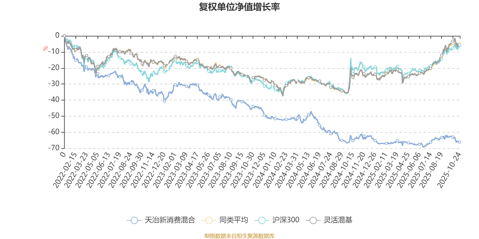 截至10月24日,天治新消费混合近三个月复权单位净值增长率为-4.86%,位于同类可比基金1267/1287;近半年复权单位净值增长率为0.81%,位于同类可比基金1271/1287;近一年复权单位净值增长率为-6.36%,位于同类可比基金1277/1287;近三年复权单位净值增长率为-48.91%,位于同类可比基金1284/1286。