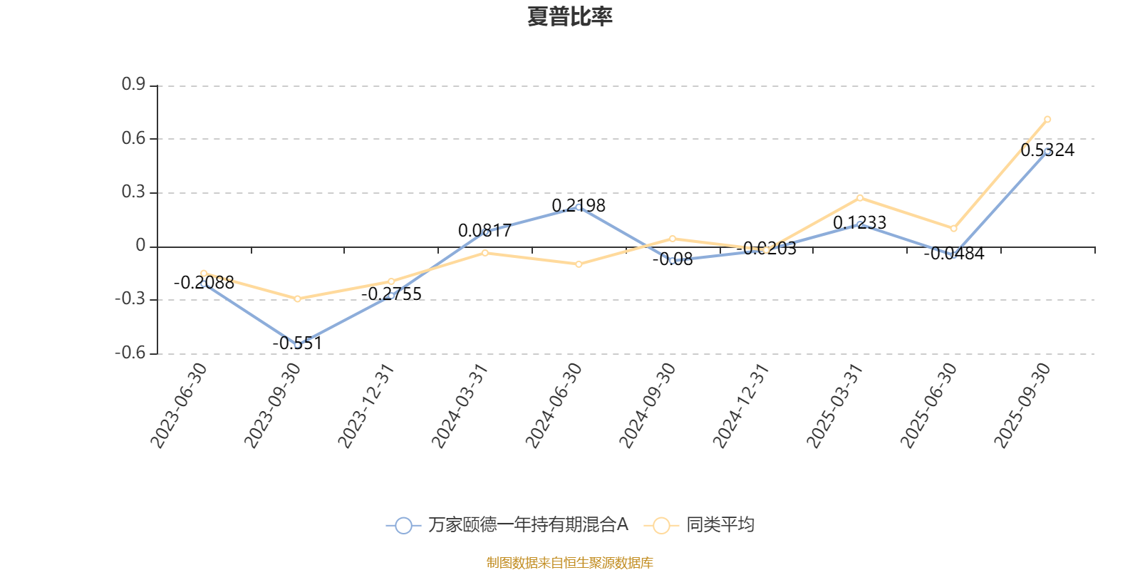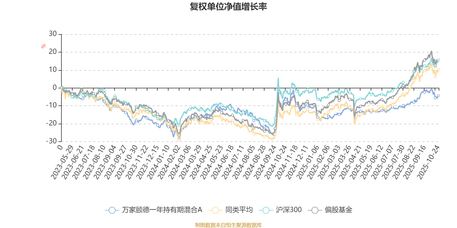 截至10月24日,万家颐德一年持有期混合A近三个月复权单位净值增长率为6.77%,位于同类可比基金482/621;近半年复权单位净值增长率为9.98%,位于同类可比基金567/618;近一年复权单位净值增长率为2.14%,位于同类可比基金592/611。