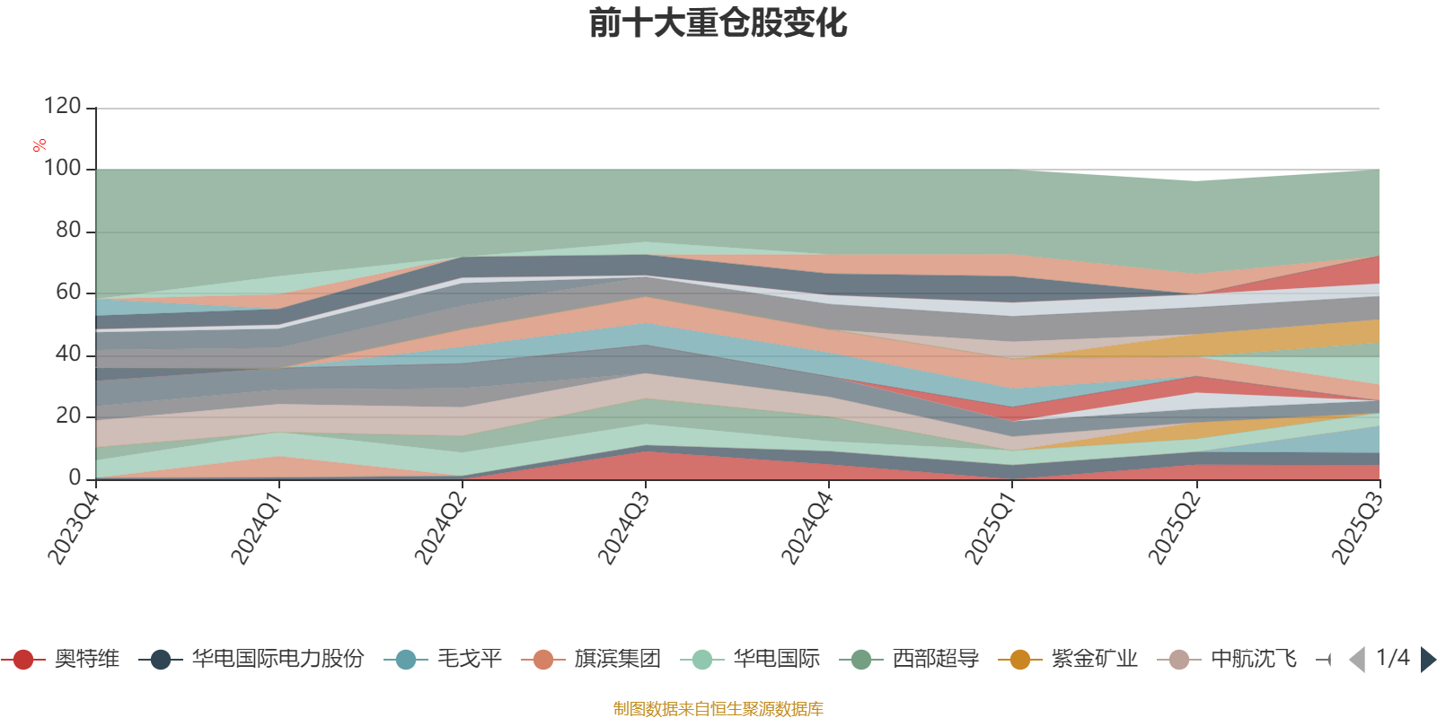 该基金持股集中度较高。截至2025年三季度末,基金重仓股分别是阿里巴巴-W、巨子生物、毛戈平、福能股份、中航光电、浙能电力、长城汽车、奥特维、华电国际、华能国际电力股份、华电国际电力股份。