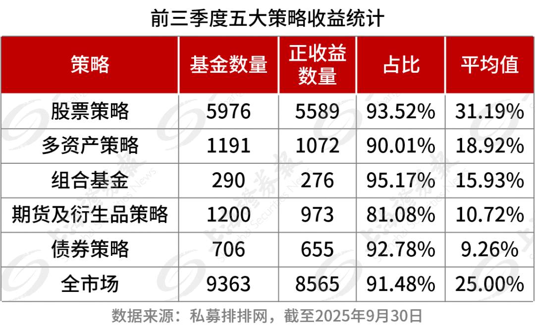 分策略来看,量化私募“更领风骚”。据私募排排网统计,前三季度38家有业绩展示的百亿级量化私募平均收益率达31.9%,较百亿级主观私募24.56%的平均收益率高出7.34个百分点。