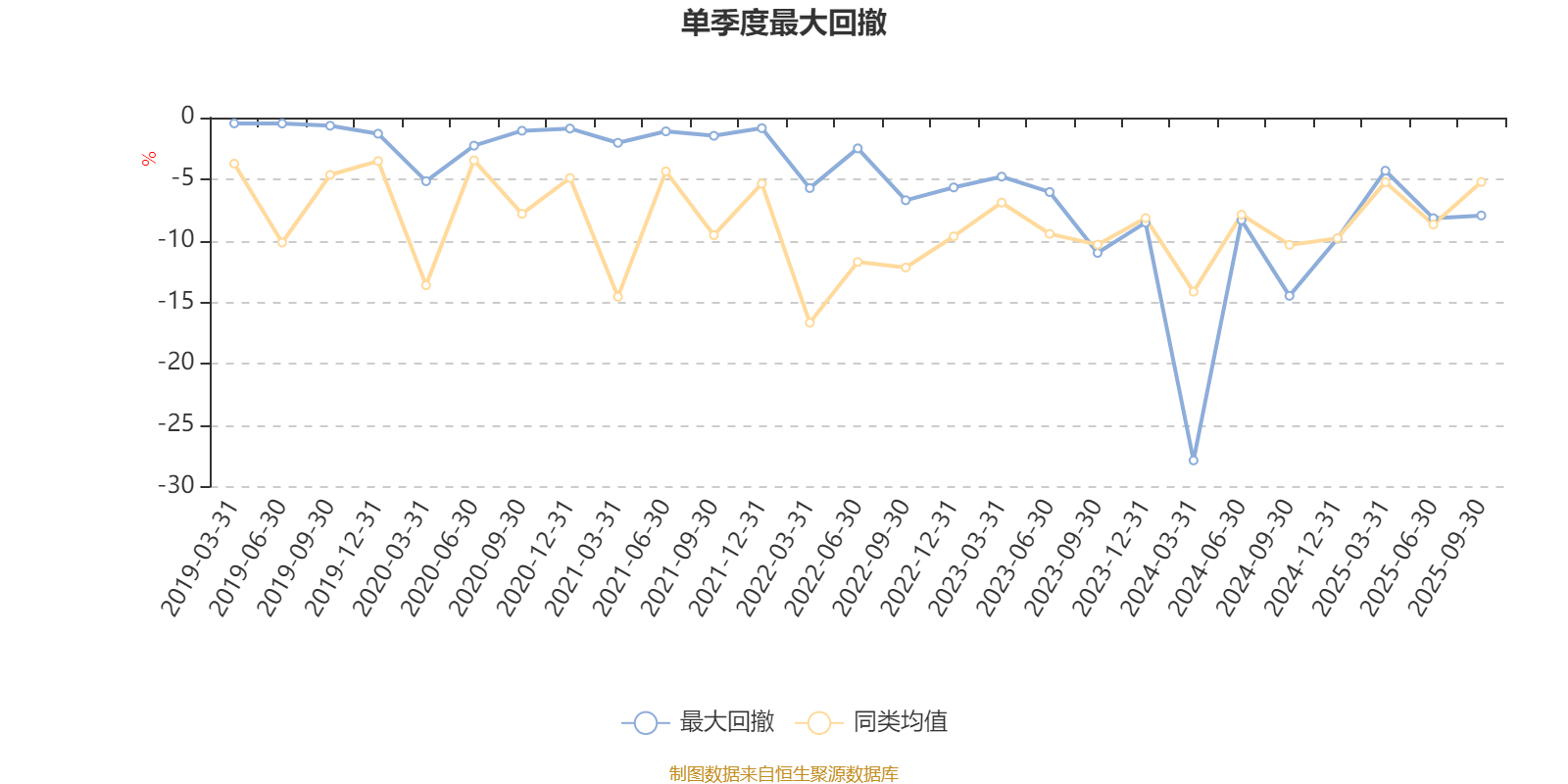 截至10月24日,基金近三年最大回撤为33.65%,同类可比基金排名669/1283。单季度最大回撤出现在2024年一季度,为27.87%。