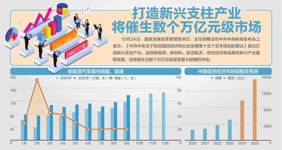 《建议》提出打造新兴支柱产业,加快新能源、新材料、航空航天、低空经济等战略性新兴产业集群发展,这将催生出数个万亿元级甚至更大规模的市场;《建议》还提出前瞻布局未来产业,推动量子科技、生物制造、氢能和核聚变能、脑机接口、具身智能、第六代移动通信等成为新的经济增长点。这些产业蓄势发力,未来10年新增规模相当于再造一个中国高技术产业。