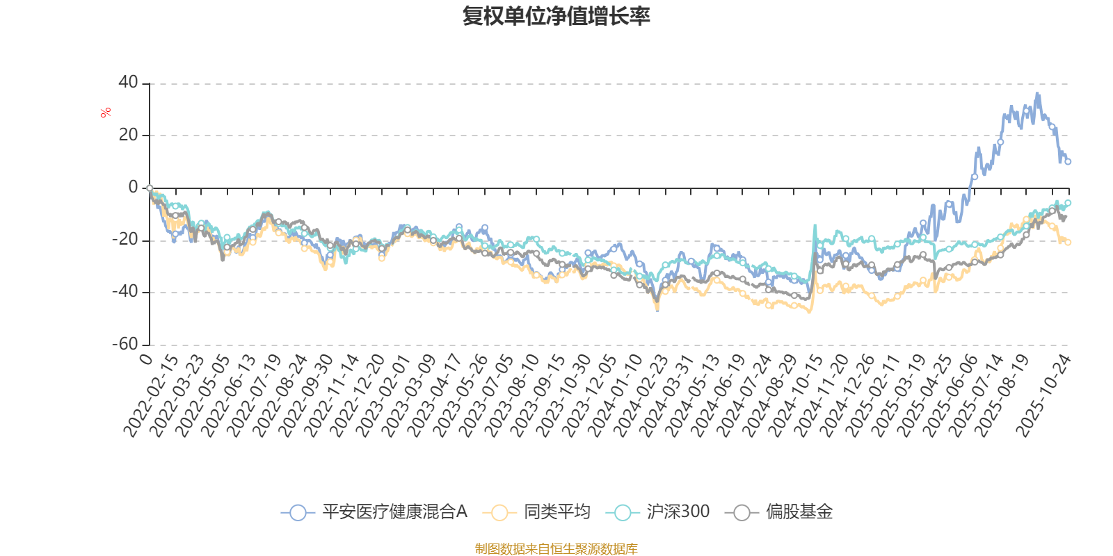 截至10月24日,平安医疗健康混合A近三个月复权单位净值增长率为-14.06%,位于同类可比基金101/106;近半年复权单位净值增长率为15.62%,位于同类可比基金70/104;近一年复权单位净值增长率为47.67%,位于同类可比基金14/101;近三年复权单位净值增长率为39.77%,位于同类可比基金9/75。