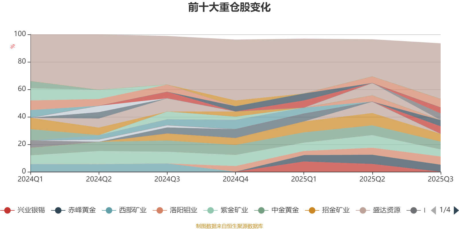 该基金持股集中度较高。截至2025年三季度末,基金十大重仓股分别是山东黄金、洛阳钼业、中金黄金、招金矿业、铜陵有色、紫金矿业、赤峰黄金、五矿资源、江西铜业股份、中国有色矿业。