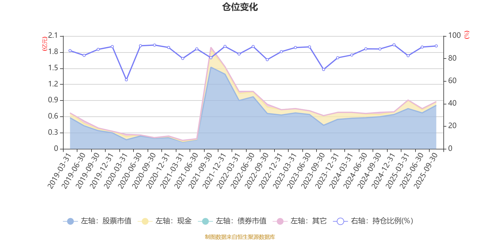 据定期报告数据统计,近三年平均股票仓位为86.16%,同类平均为72.18%。2024年末基金达到92.19%的最高仓位,2020年一季度末最低,为61.22%。