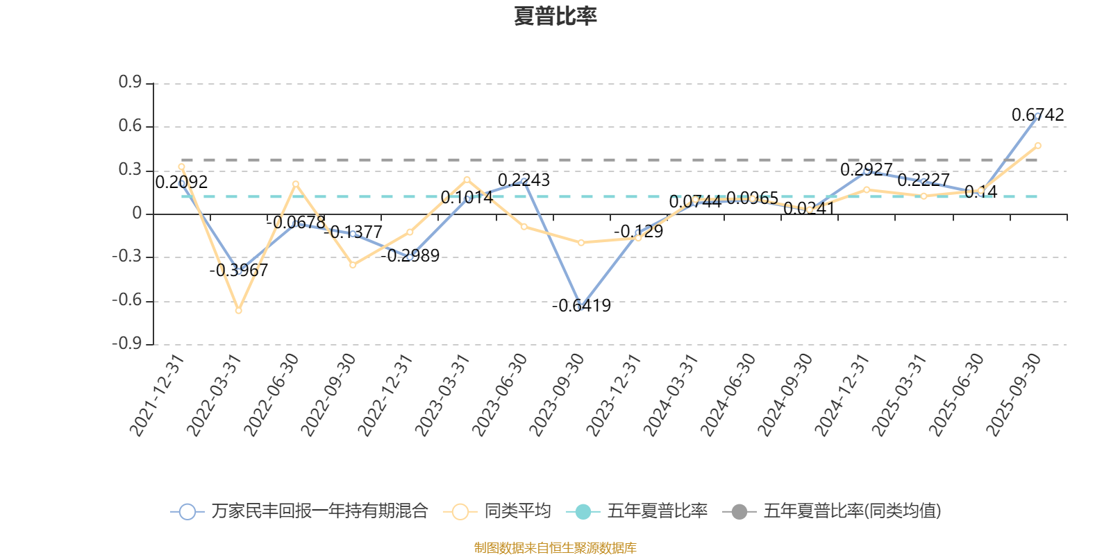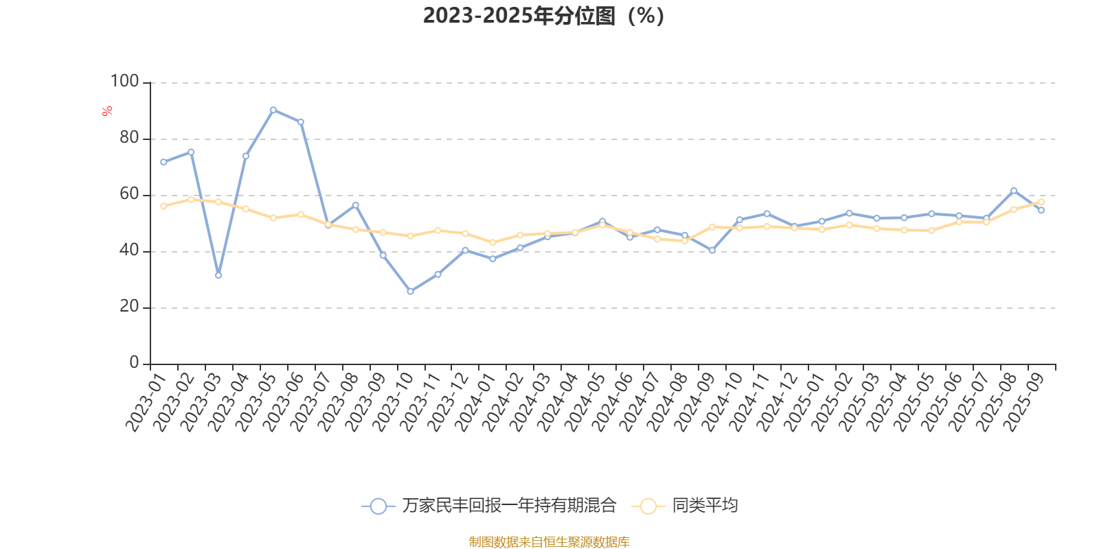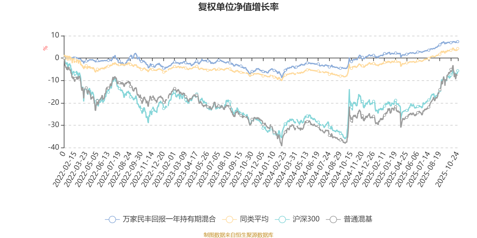 截至10月24日,万家民丰回报一年持有期混合近三个月复权单位净值增长率为3.17%,位于同类可比基金210/629;近半年复权单位净值增长率为5.56%,位于同类可比基金287/629;近一年复权单位净值增长率为8.29%,位于同类可比基金224/623;近三年复权单位净值增长率为10.35%,位于同类可比基金309/556。