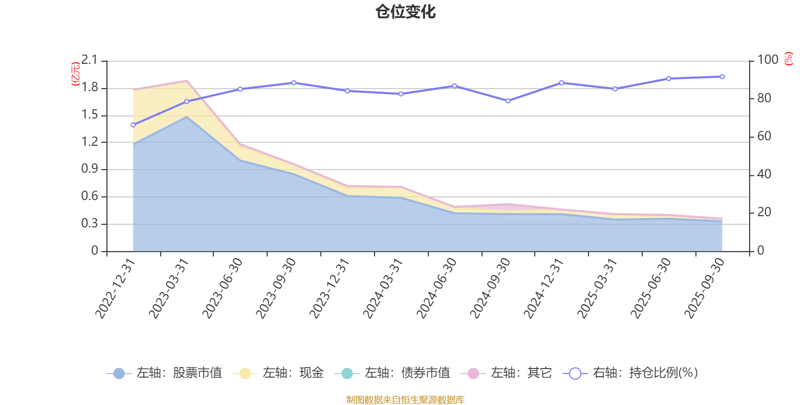 据定期报告数据统计,近三年平均股票仓位为83.92%,同类平均为83.41%。2025年三季度末基金达到91.67%的最高仓位,2022年末最低,为66.34%。