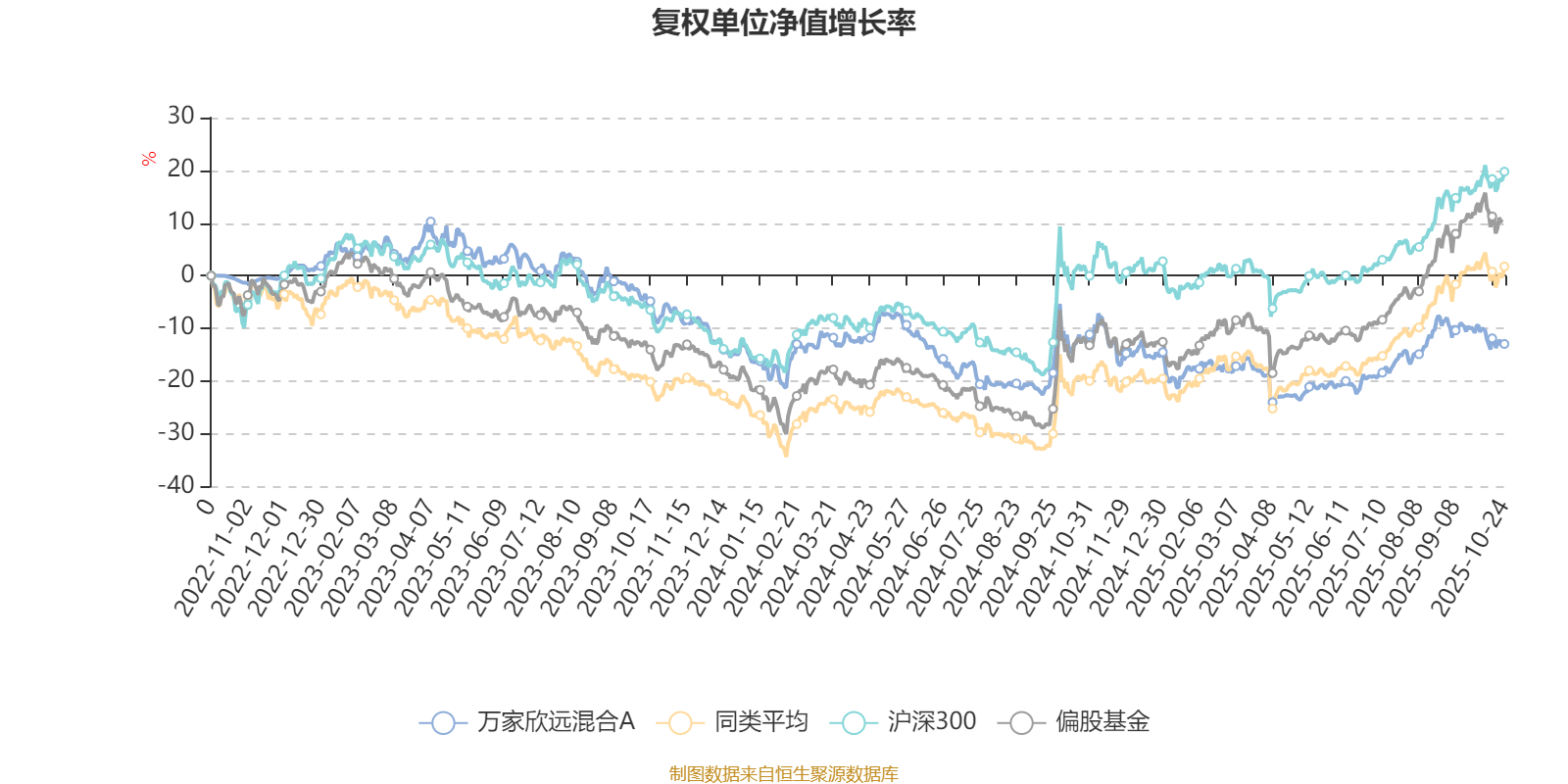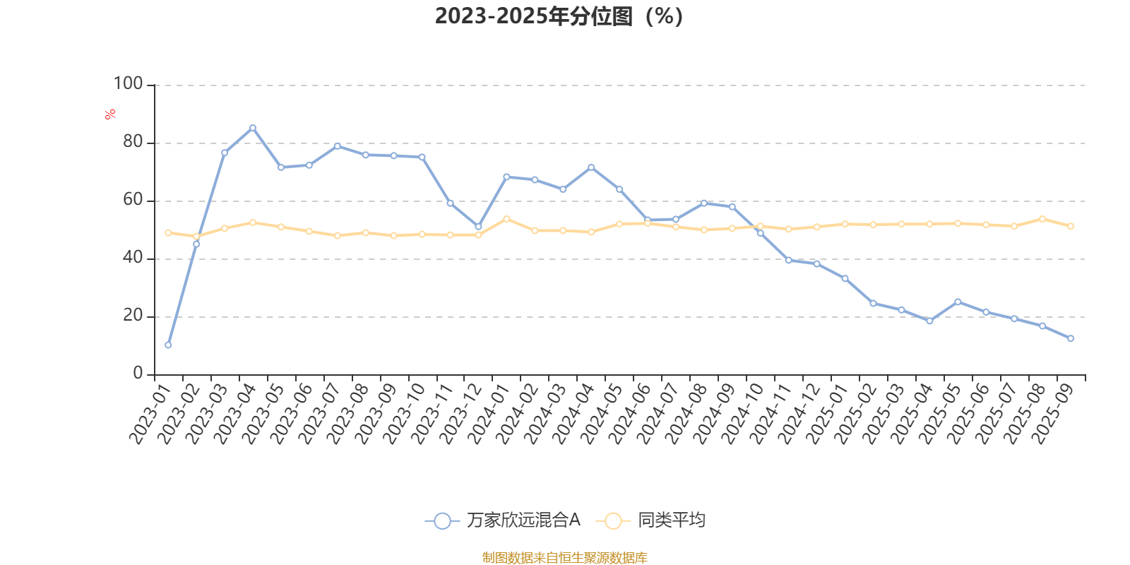 截至10月24日,万家欣远混合A近三个月复权单位净值增长率为2.16%,位于同类可比基金614/689;近半年复权单位净值增长率为12.73%,位于同类可比基金580/688;近一年复权单位净值增长率为-0.38%,位于同类可比基金635/653;近三年复权单位净值增长率为-12.51%,位于同类可比基金308/363。