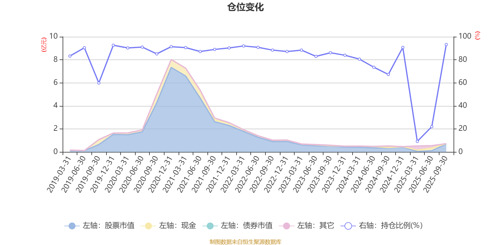 据定期报告数据统计,近三年平均股票仓位为72.12%,同类平均为72.18%。2025年三季度末基金达到93.28%的最高仓位,2025年一季度末最低,为9.26%。
