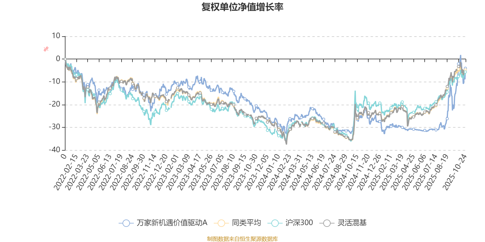 截至10月24日,万家新机遇价值驱动A近三个月复权单位净值增长率为36.34%,位于同类可比基金107/1287;近半年复权单位净值增长率为38.66%,位于同类可比基金262/1287;近一年复权单位净值增长率为29.43%,位于同类可比基金452/1287;近三年复权单位净值增长率为18.04%,位于同类可比基金533/1286。