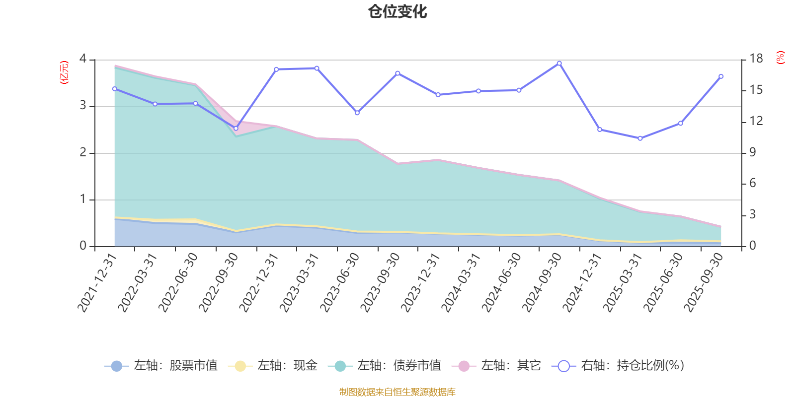 据定期报告数据统计,近三年平均股票仓位为14.66%,同类平均为19.03%。2024年三季度末基金达到17.64%的最高仓位,2025年一季度末最低,为10.41%。