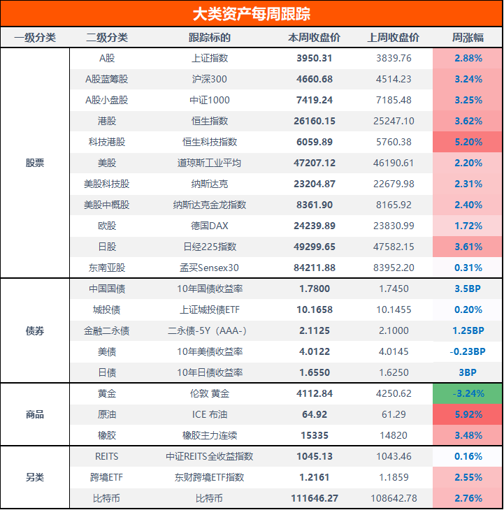 2025年政府债供给已经接近尾声,但2026年预计广义财政仍将扩张,中长期视角需关注政府债期限维度的供需匹配压力对超长期限利差带来的走阔压力。本周10年期国债收益率上行3.5BP,上证城投债ETF上涨0.2%,10Y美债收益率继续下行。