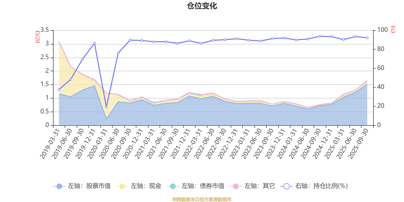 据定期报告数据统计,近三年平均股票仓位为91.37%,同类平均为72.18%。2024年三季度末基金达到93.72%的最高仓位,2020年一季度末最低,为19.18%。