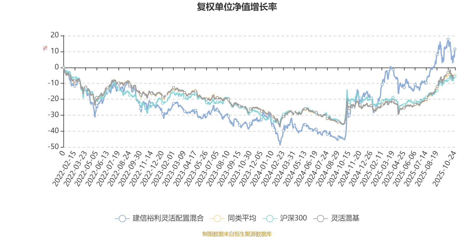 截至10月24日,建信裕利灵活配置混合近三个月复权单位净值增长率为16.50%,位于同类可比基金450/1287;近半年复权单位净值增长率为27.59%,位于同类可比基金504/1287;近一年复权单位净值增长率为49.81%,位于同类可比基金153/1287;近三年复权单位净值增长率为44.13%,位于同类可比基金159/1286。