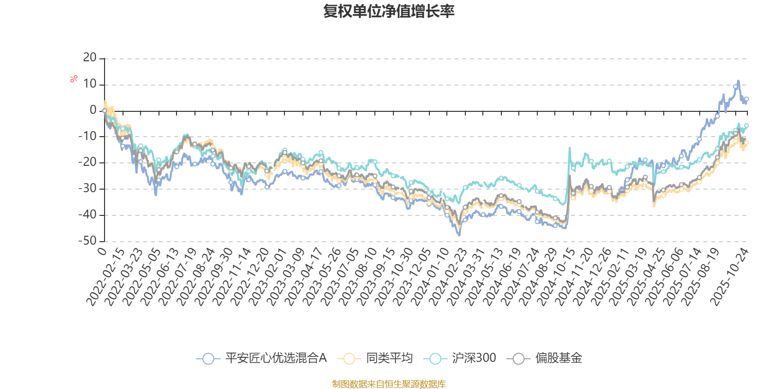 截至10月24日,平安匠心优选混合A近三个月复权单位净值增长率为10.67%,位于同类可比基金171/265;近半年复权单位净值增长率为30.94%,位于同类可比基金103/265;近一年复权单位净值增长率为49.24%,位于同类可比基金36/265;近三年复权单位净值增长率为51.05%,位于同类可比基金22/253。
