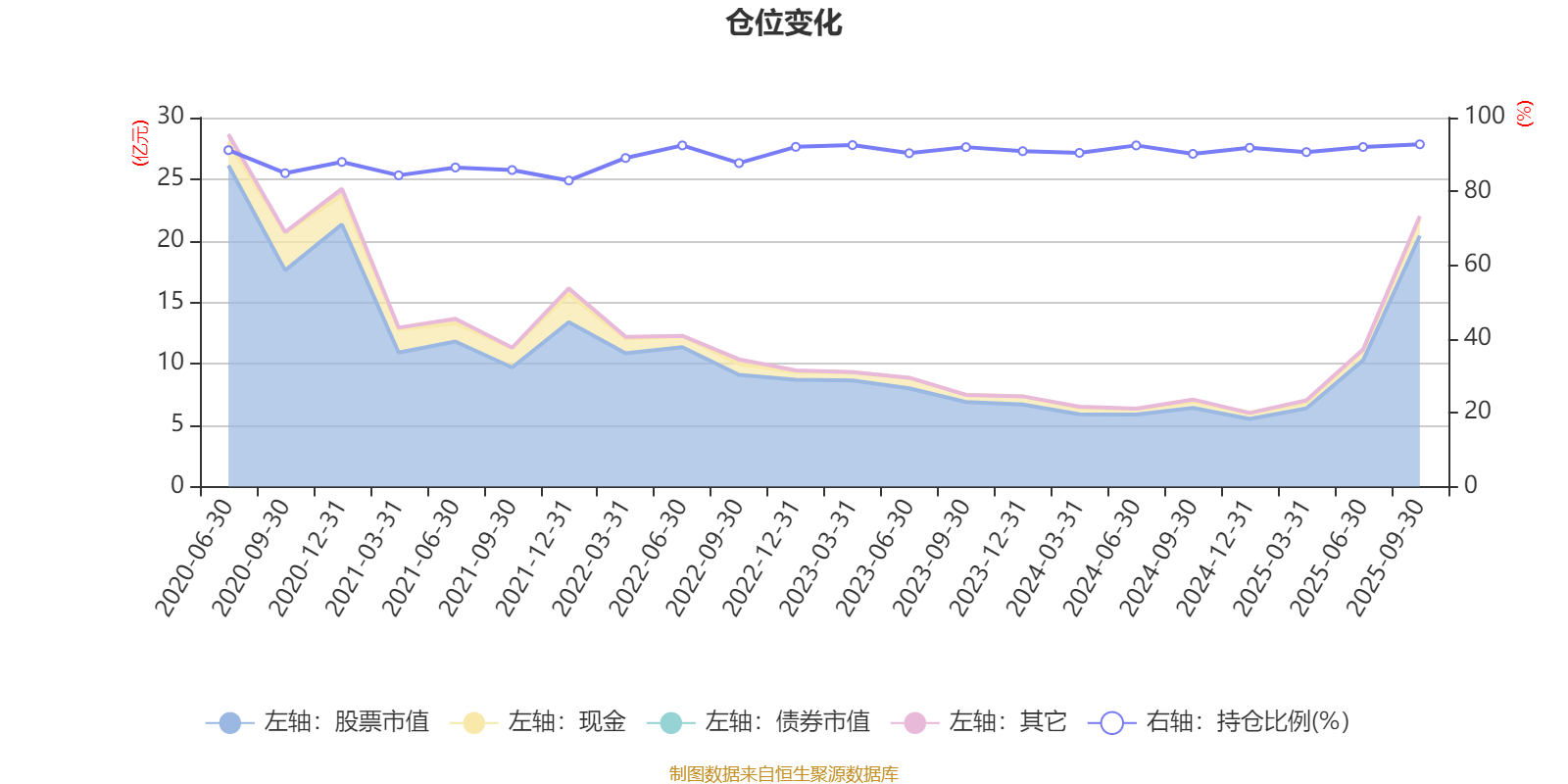 据定期报告数据统计,近三年平均股票仓位为91.52%,同类平均为85.84%。2025年三季度末基金达到92.76%的最高仓位,2021年末最低,为82.94%。