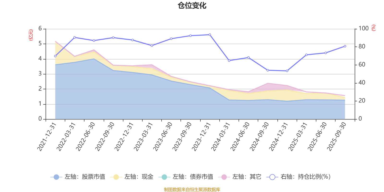 据定期报告数据统计,近三年平均股票仓位为75.82%,同类平均为85.47%。2023年末基金达到93.48%的最高仓位,2024年末最低,为53.48%。