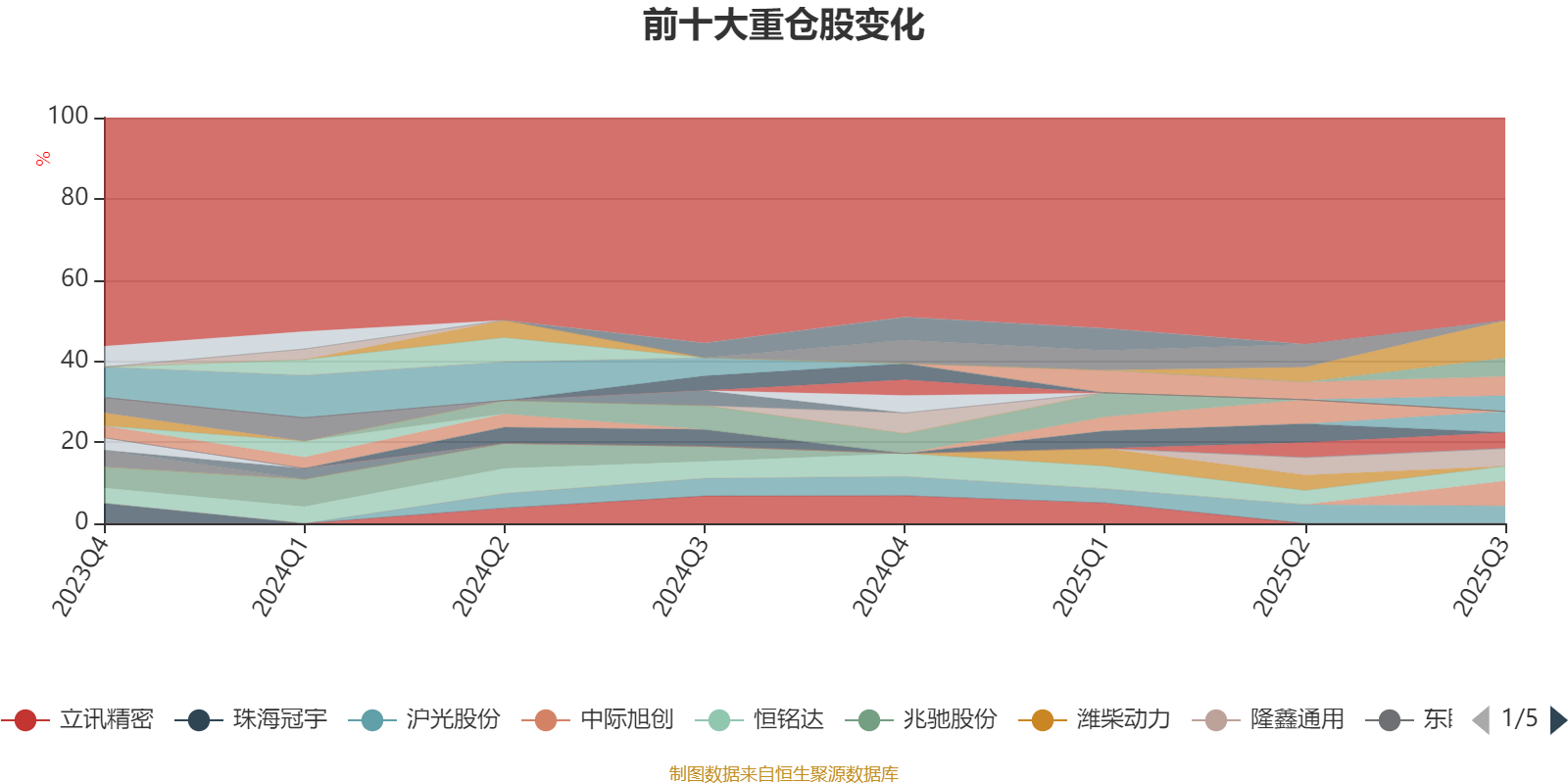 截至2025年三季度末,基金十大重仓股分别是新易盛、中际旭创、寒武纪、思瑞浦、东材科技、隆鑫通用、沪光股份、路维光电、赛轮轮胎、恒铭达。