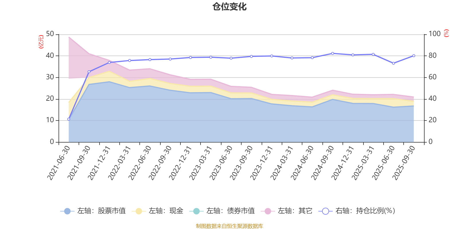 据定期报告数据统计,近三年平均股票仓位为79.1%,同类平均为85.94%。2024年三季度末基金达到82.31%的最高仓位,2021年上半年末最低,为21.33%。