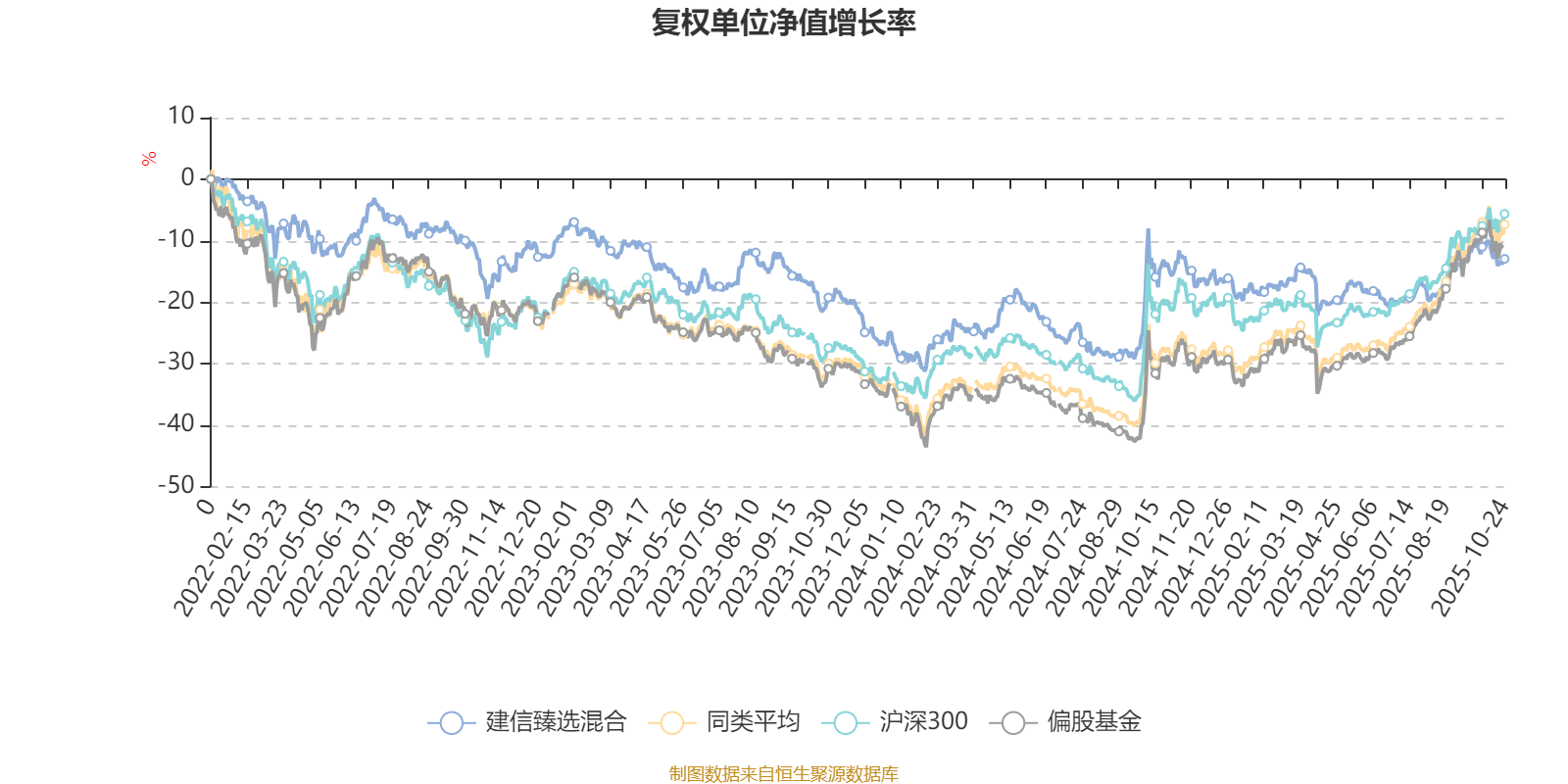 截至10月24日,建信臻选混合近三个月复权单位净值增长率为4.24%,位于同类可比基金110/130;近半年复权单位净值增长率为8.24%,位于同类可比基金121/130;近一年复权单位净值增长率为1.50%,位于同类可比基金126/130;近三年复权单位净值增长率为2.88%,位于同类可比基金97/124。