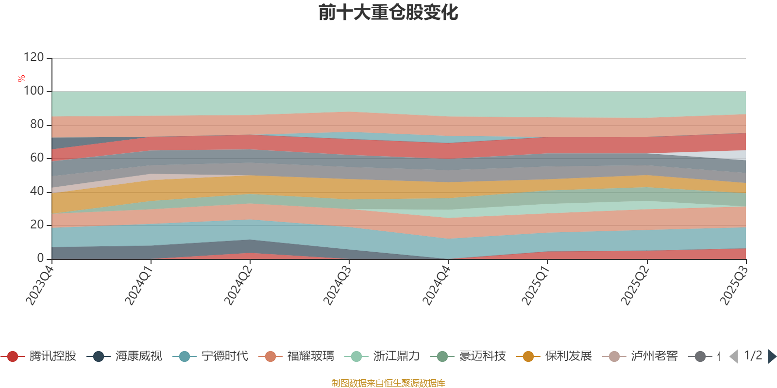 该基金持股集中度较高,且持股标的较为稳定,近2年前十大重仓股集中度长期超过60%。截至2025年三季度末,基金十大重仓股分别是宁德时代、福耀玻璃、贵州茅台、星宇股份、豪迈科技、山西汾酒、腾讯控股、保利发展、牧原股份、亿联网络。