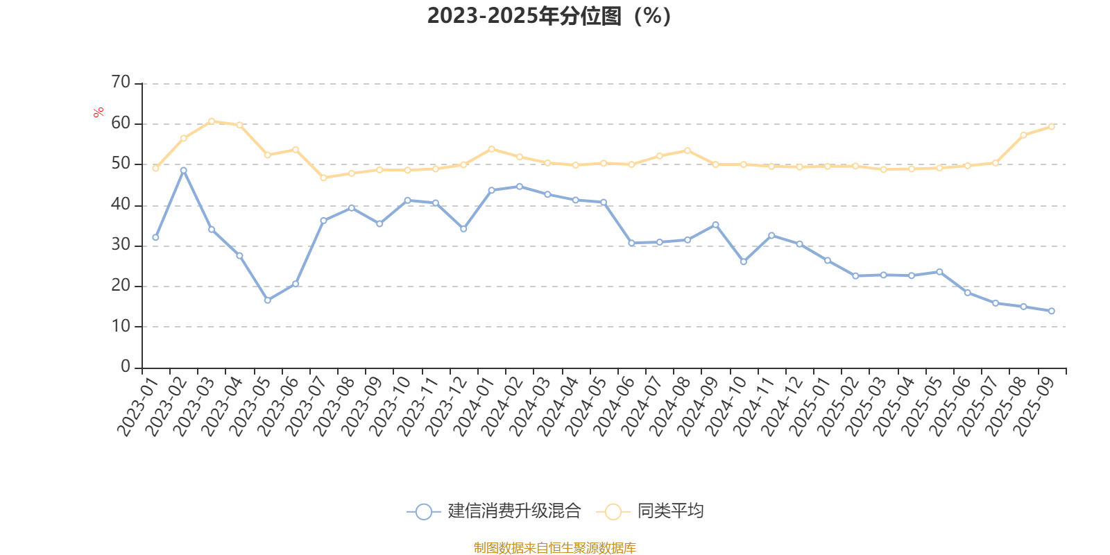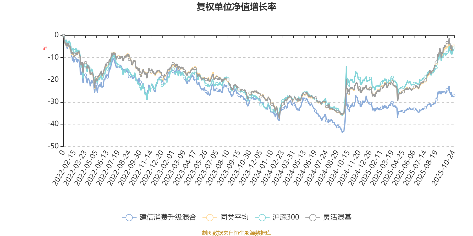 截至10月24日,建信消费升级混合近三个月复权单位净值增长率为5.64%,位于同类可比基金874/1287;近半年复权单位净值增长率为10.90%,位于同类可比基金989/1287;近一年复权单位净值增长率为7.58%,位于同类可比基金1029/1287;近三年复权单位净值增长率为-1.20%,位于同类可比基金995/1286。