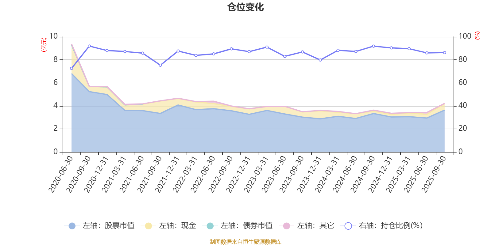 据定期报告数据统计,近三年平均股票仓位为87.28%,同类平均为85.47%。2020年三季度末基金达到91.93%的最高仓位,2020年上半年末最低,为72.56%。