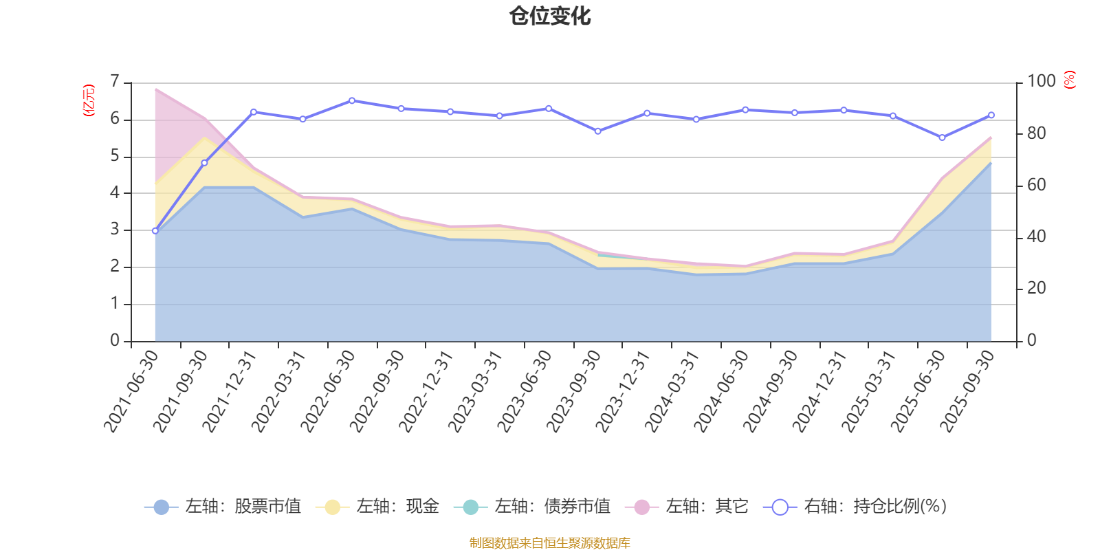 据定期报告数据统计,近三年平均股票仓位为86.78%,同类平均为85.47%。2022年上半年末基金达到93.01%的最高仓位,2021年上半年末最低,为42.7%。