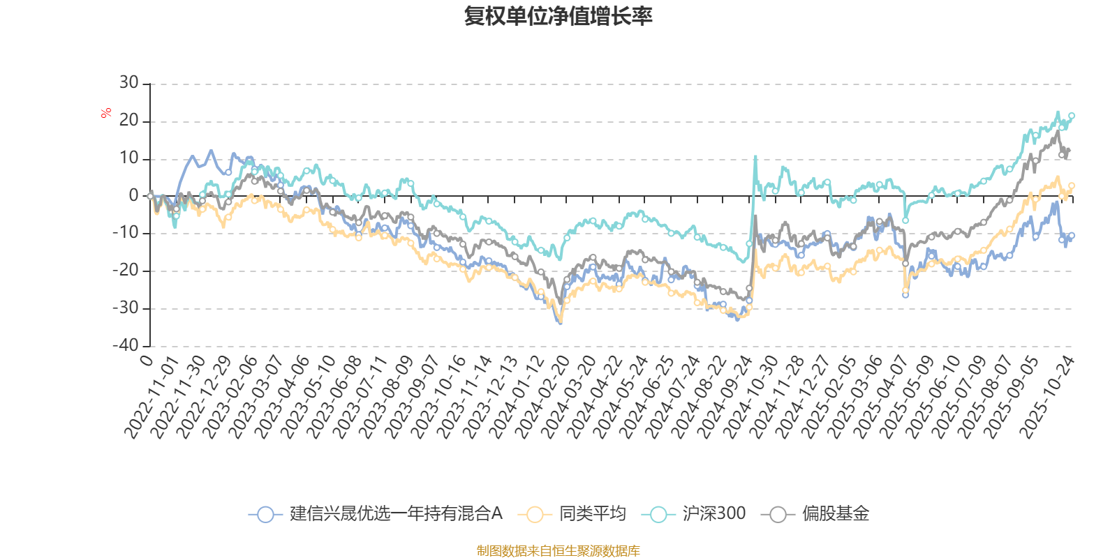 截至10月24日,建信兴晟优选一年持有混合A近三个月复权单位净值增长率为6.05%,位于同类可比基金521/689;近半年复权单位净值增长率为10.54%,位于同类可比基金623/688;近一年复权单位净值增长率为2.38%,位于同类可比基金628/653;近三年复权单位净值增长率为-10.04%,位于同类可比基金298/363。