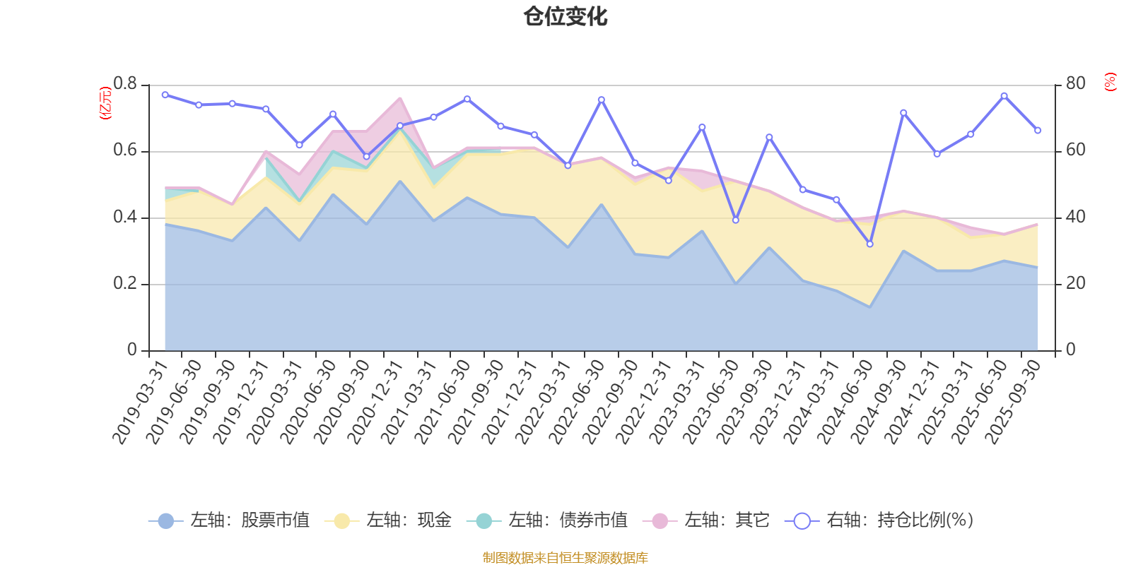 据定期报告数据统计,近三年平均股票仓位为57.23%,同类平均为72.18%。2019年一季度末基金达到76.99%的最高仓位,2024年上半年末最低,为32.08%。