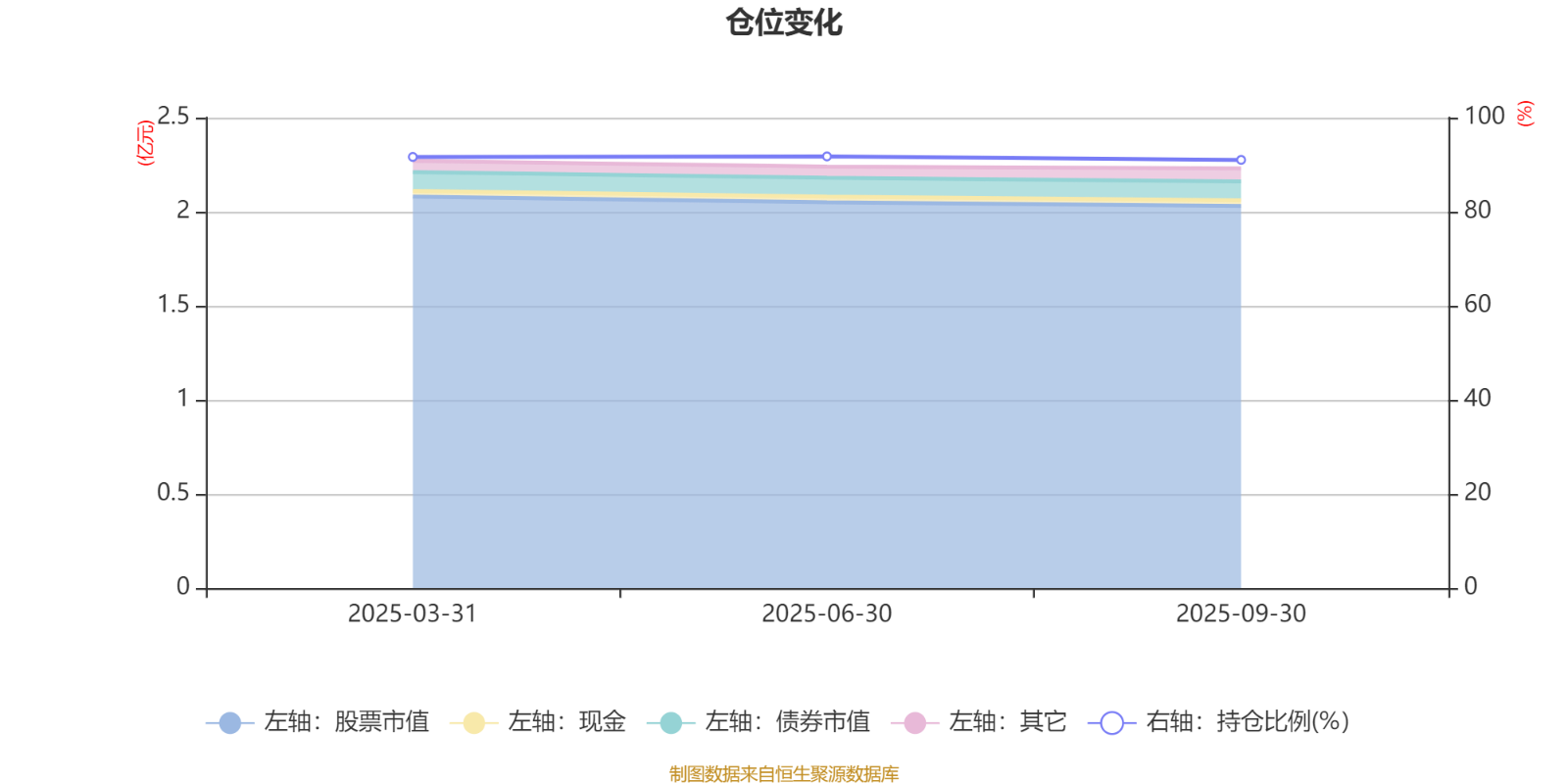 据定期报告数据统计,基金股票仓位长期保持较高水平,成立以来平均股票仓位为91.47%,同类平均为86.37%。2025年上半年末基金达到91.75%的最高仓位,2025年三季度末最低,为91.01%。