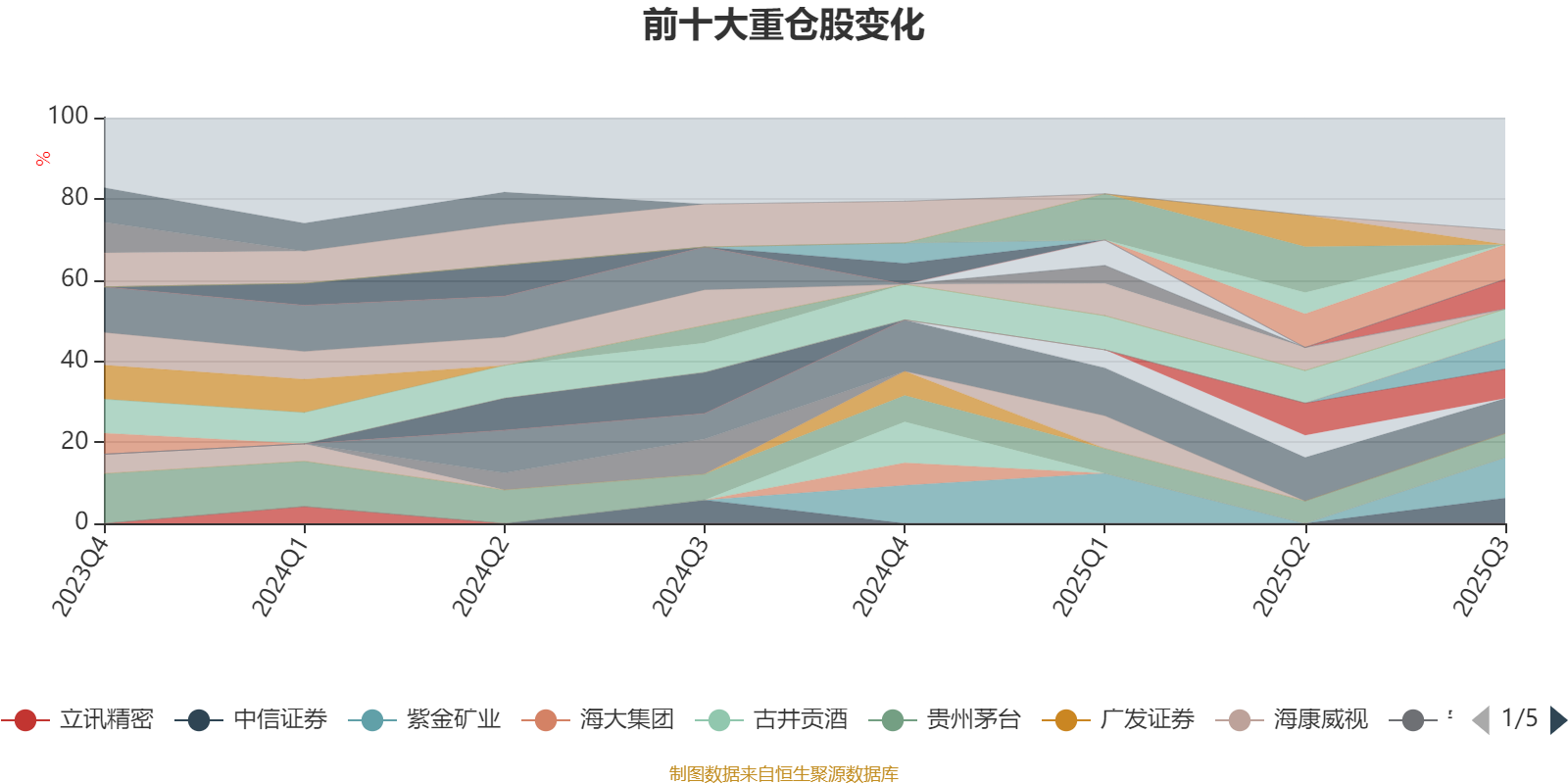 该基金持股集中度较高,近2年前十大重仓股集中度长期超过60%。截至2025年三季度末,基金十大重仓股分别是紫金矿业、福耀玻璃、中国平安、中国国航、海光信息、春秋航空、深信服、中信证券、贵州茅台、山西汾酒。