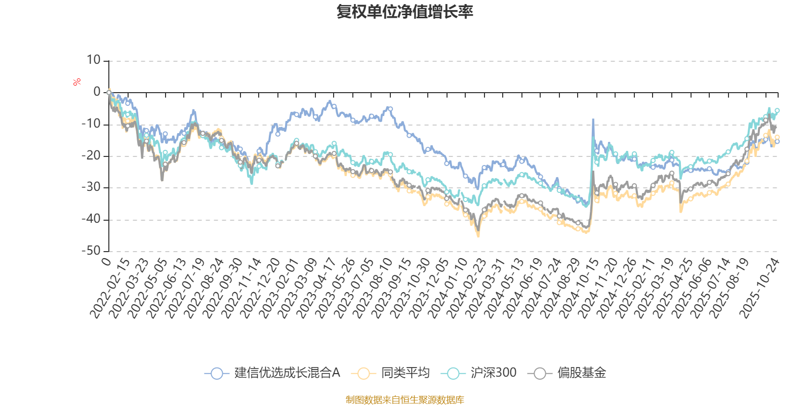截至10月24日,建信优选成长混合A近三个月复权单位净值增长率为8.90%,位于同类可比基金137/185;近半年复权单位净值增长率为12.19%,位于同类可比基金163/185;近一年复权单位净值增长率为1.17%,位于同类可比基金179/181;近三年复权单位净值增长率为9.86%,位于同类可比基金117/175。