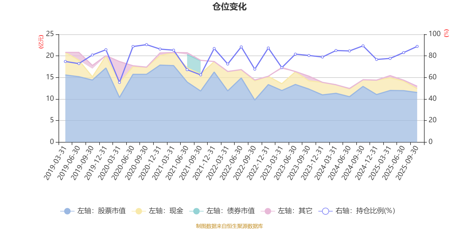 据定期报告数据统计,近三年平均股票仓位为81.89%,同类平均为87.53%。2020年三季度末基金达到90.46%的最高仓位,2020年一季度末最低,为55.37%。