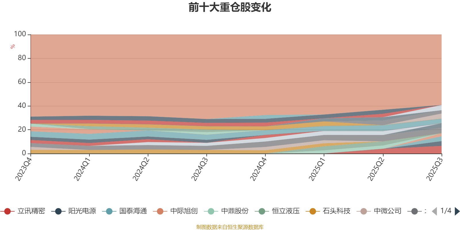 截至2025年三季度末,基金十大重仓股分别是立讯精密、北方华创、工业富联、恒瑞医药、国泰海通、阳光电源、招商银行、宁德时代、中国平安、中际旭创。