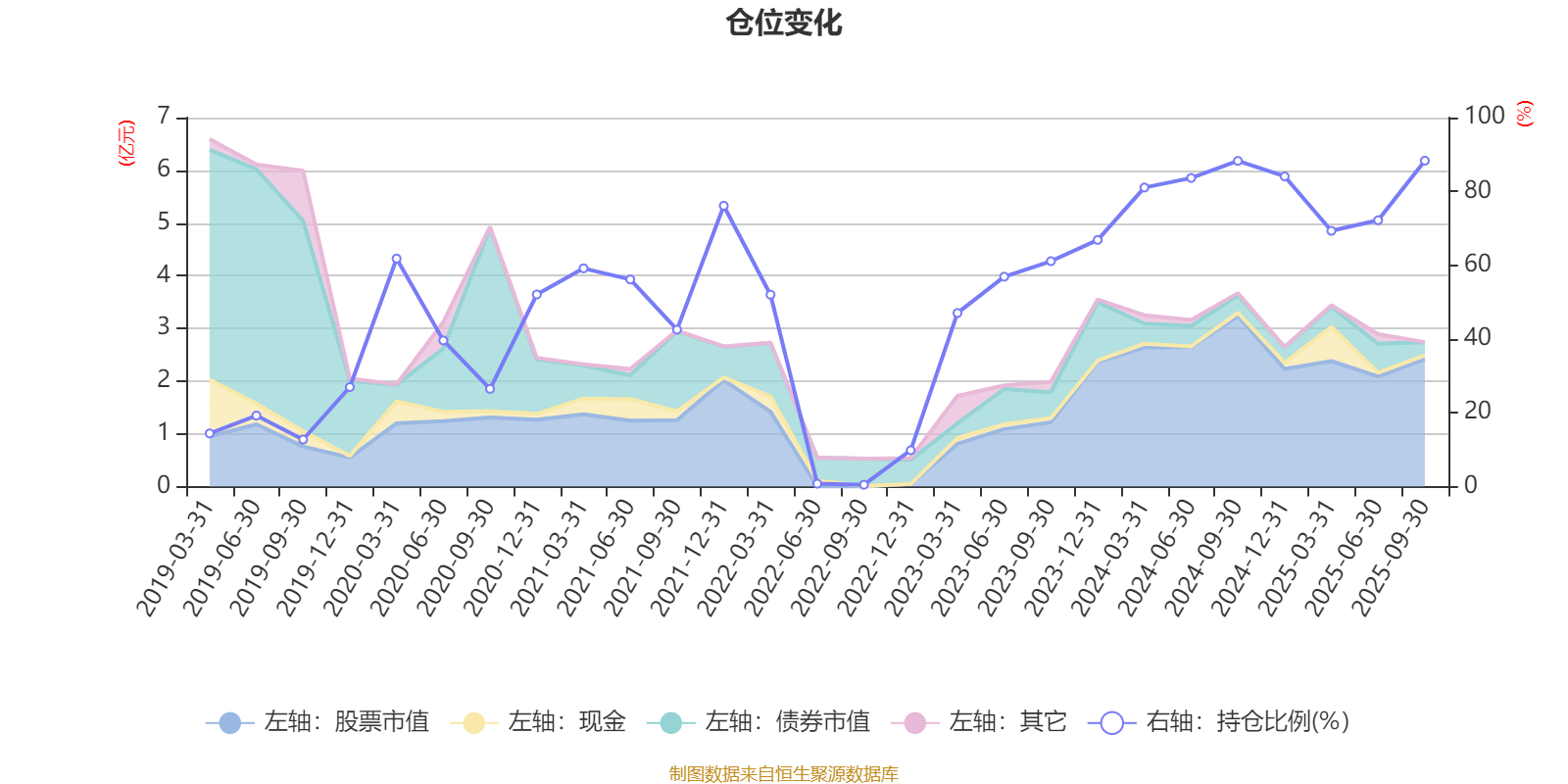 据定期报告数据统计,近三年平均股票仓位为67.38%,同类平均为72.18%。2025年三季度末基金达到88.33%的最高仓位,2022年三季度末最低,为0.49%。