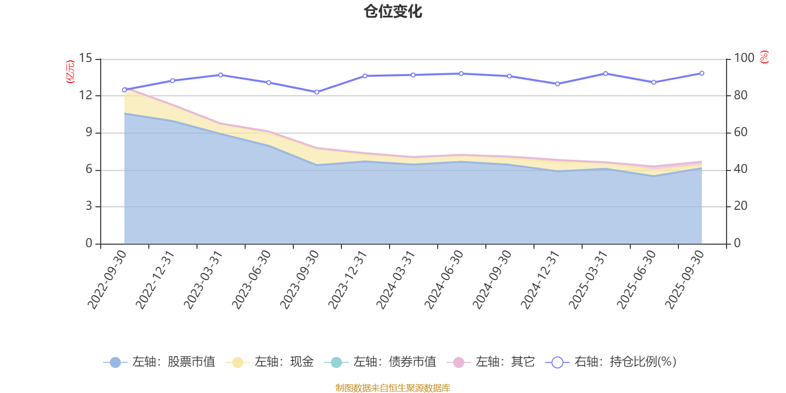 据定期报告数据统计,近三年平均股票仓位为89.34%,同类平均为85.87%。2025年三季度末基金达到92.27%的最高仓位,2023年三季度末最低,为82.08%。