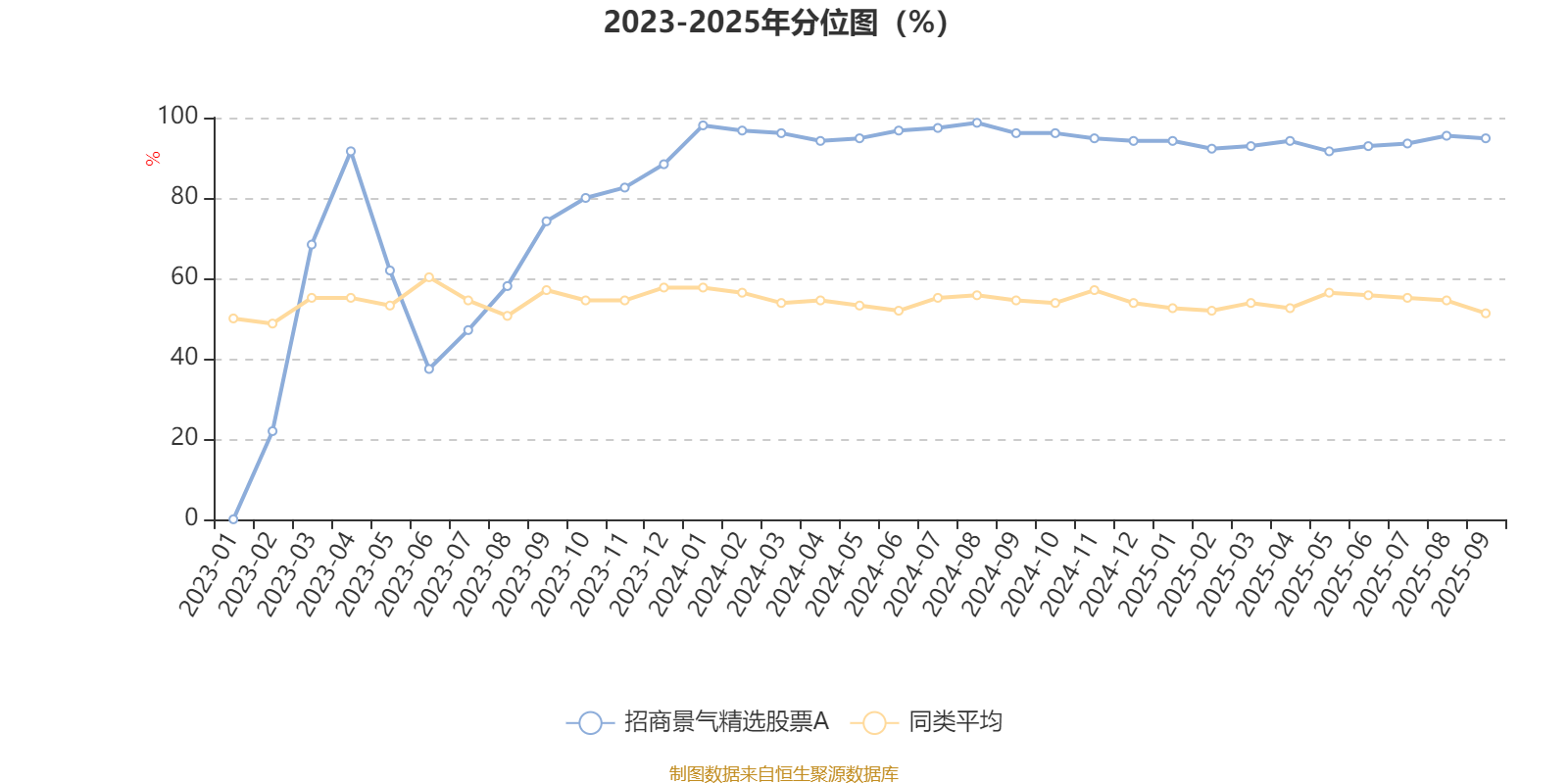 通过所选区间该基金净值增长率分位图,可以观察该基金与同类基金业绩比较情况。图为坐标原点到区间内某时点的净值增长率在同类基金中的分位数。