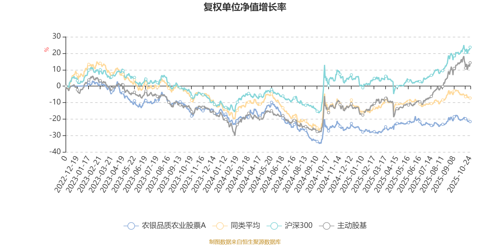 截至10月24日,农银品质农业股票A近三个月复权单位净值增长率为1.06%,位于同类可比基金19/43;近半年复权单位净值增长率为0.55%,位于同类可比基金28/43;近一年复权单位净值增长率为5.05%,位于同类可比基金23/43。