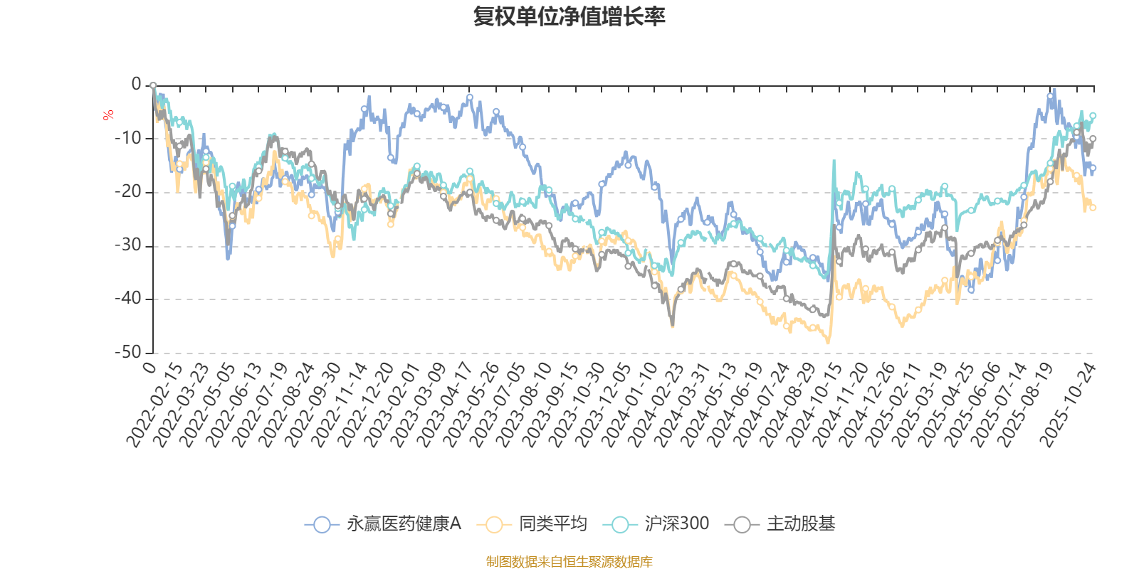 截至10月24日,永赢医药健康A近三个月复权单位净值增长率为-5.31%,位于同类可比基金37/57;近半年复权单位净值增长率为36.47%,位于同类可比基金2/57;近一年复权单位净值增长率为11.60%,位于同类可比基金47/55;近三年复权单位净值增长率为-4.03%,位于同类可比基金30/48。