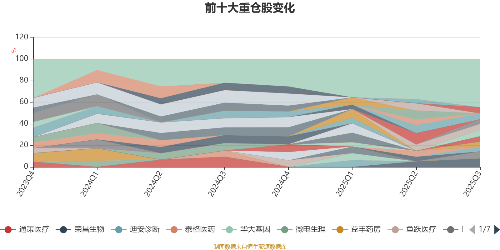 该基金持股集中度较高。截至2025年三季度末,基金十大重仓股分别是荣昌生物、皓元医药、药明康德、艾迪药业、益方生物、奥赛康、京新药业、长春高新、乐普医疗、普洛药业。