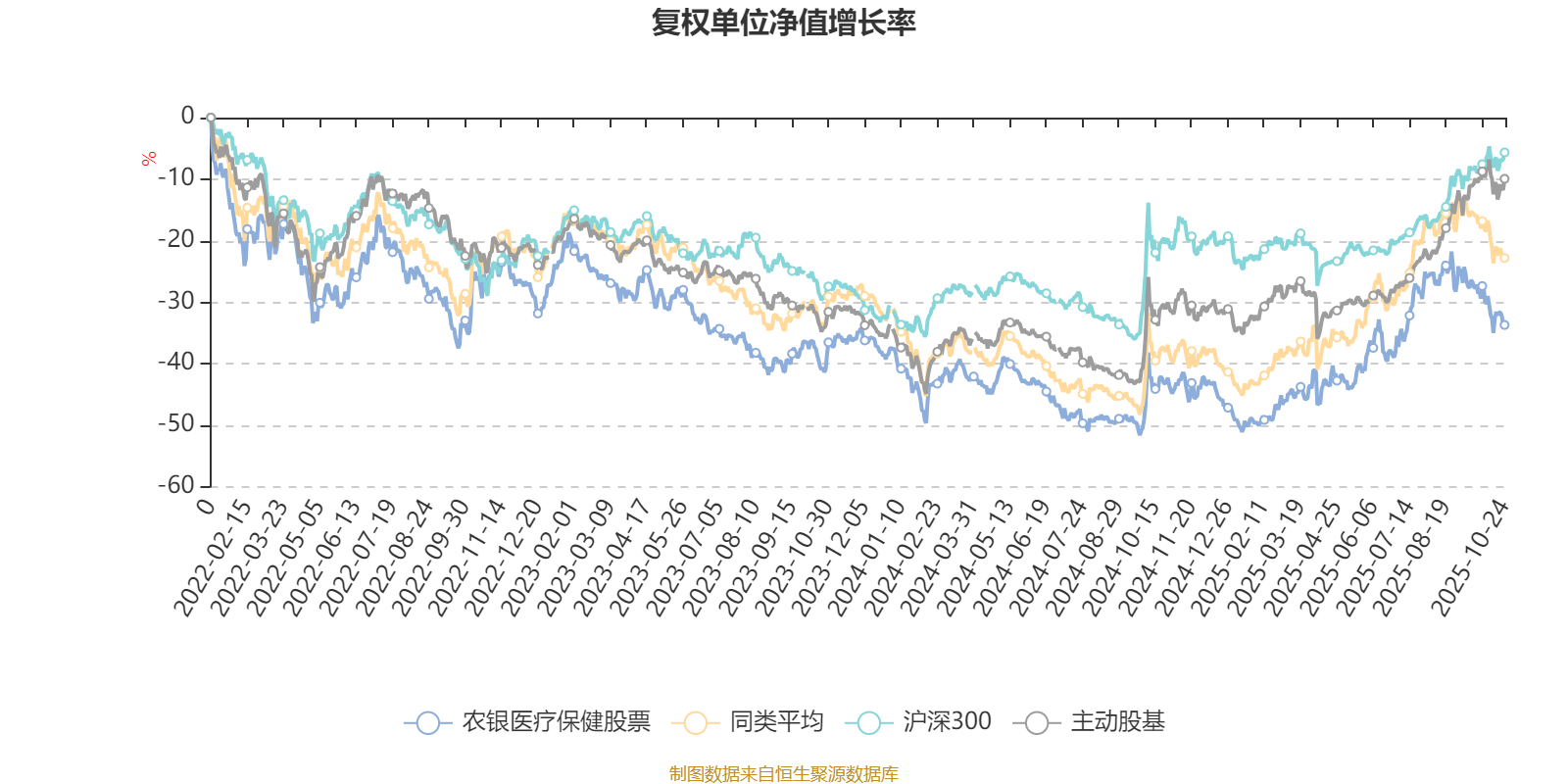 截至10月24日,农银医疗保健股票近三个月复权单位净值增长率为-7.49%,位于同类可比基金45/57;近半年复权单位净值增长率为13.56%,位于同类可比基金44/57;近一年复权单位净值增长率为16.80%,位于同类可比基金40/55;近三年复权单位净值增长率为-8.28%,位于同类可比基金35/48。