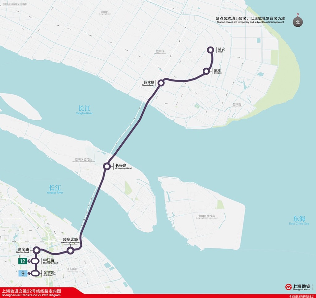 上海轨道交通22号线(崇明线)线路走向图。上海地铁供图