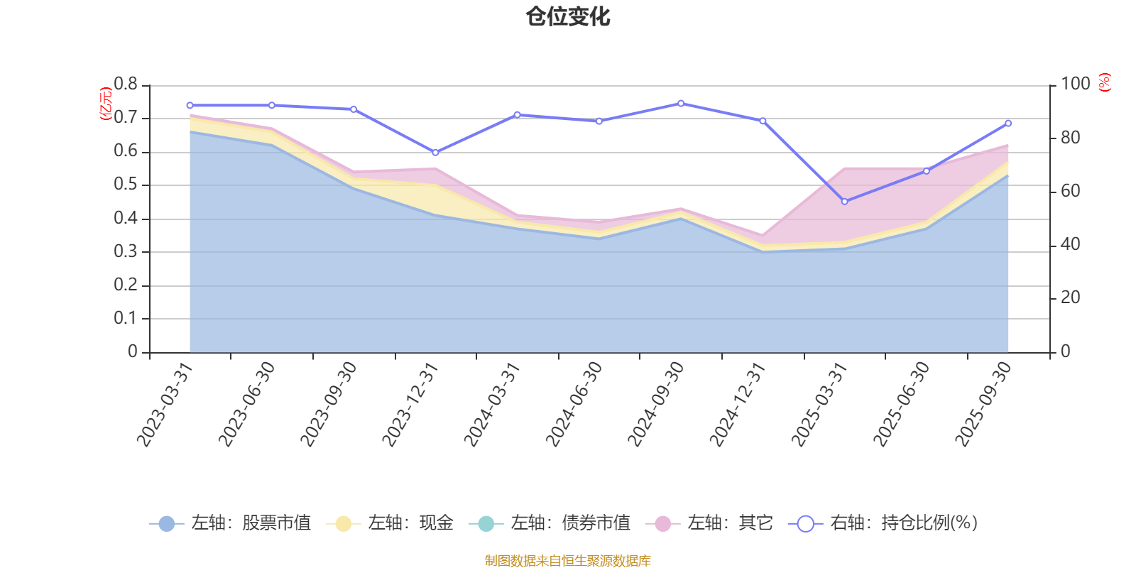 据定期报告数据统计,成立以来平均股票仓位为83.3%,同类平均为87%。2024年三季度末基金达到93.2%的最高仓位,2025年一季度末最低,为56.49%。