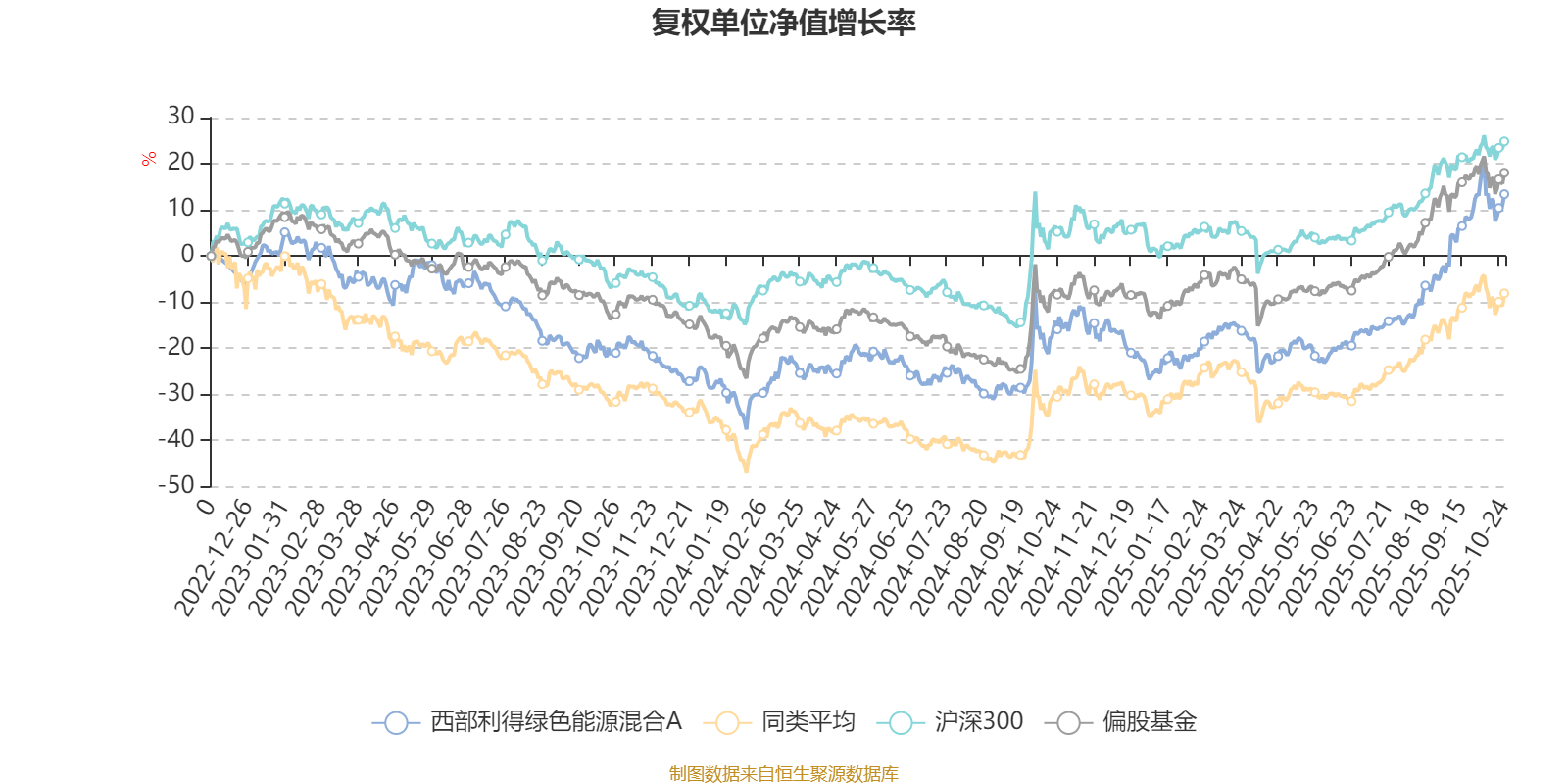 截至10月24日,西部利得绿色能源混合A近三个月复权单位净值增长率为30.95%,位于同类可比基金17/100;近半年复权单位净值增长率为43.11%,位于同类可比基金21/99;近一年复权单位净值增长率为34.86%,位于同类可比基金35/90。