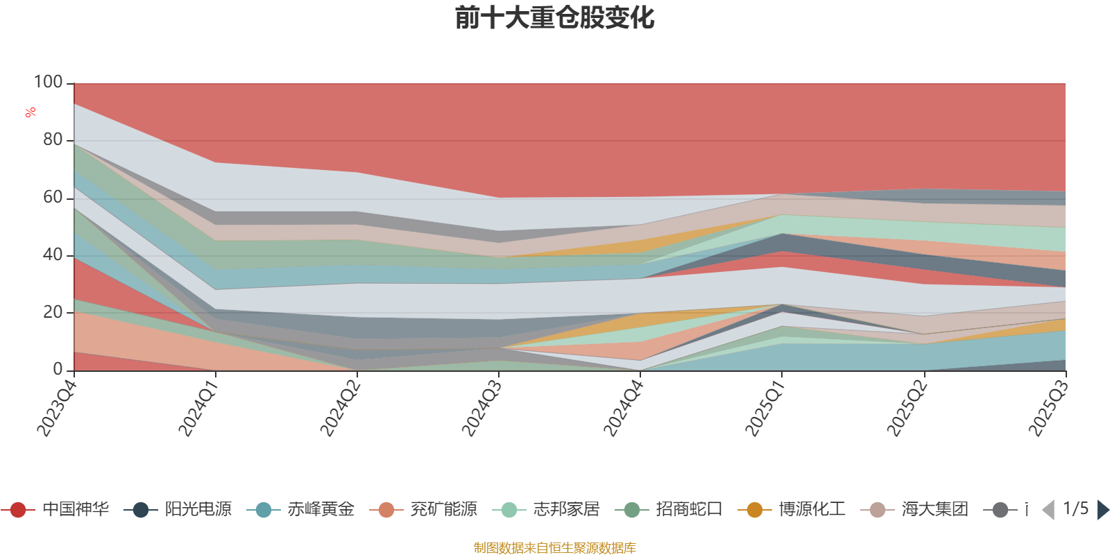 该基金持股集中度较高,近2年前十大重仓股集中度长期超过60%。截至2025年三季度末,基金十大重仓股分别是赤峰黄金、恒瑞医药、三一重工、金风科技、新华保险、山金国际、艾迪药业、保利发展、博源化工、阳光电源。