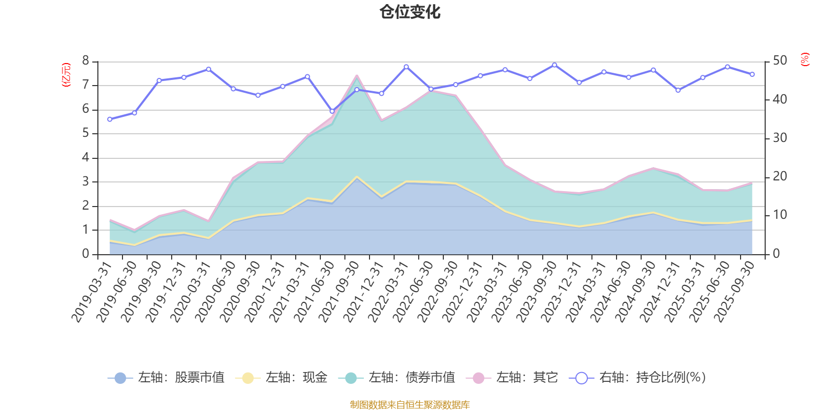 据定期报告数据统计,近三年平均股票仓位为46.51%,同类平均为19.03%。2023年三季度末基金达到49.11%的最高仓位,2019年一季度末最低,为35.03%。