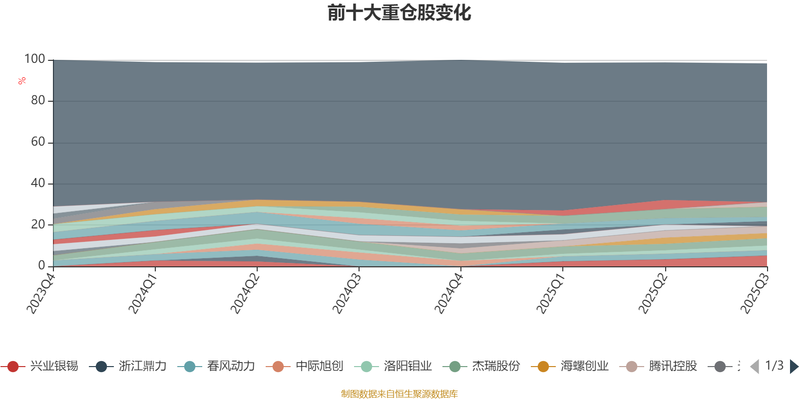 截至2025年三季度末,基金十大重仓股分别是兴业银锡、恺英网络、杰瑞股份、腾讯控股、春风动力、海螺创业、药明康德、五矿资源、洛阳钼业、常熟银行。